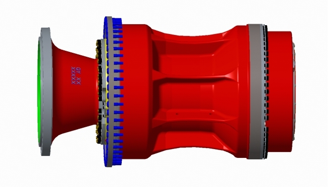 产品概述:G714A机械式终传动集成了传动、行驻车制动功能,传动形式采用NGW两级行星传动,制动为双活塞的行驻车一体式制动器,是由中车戚墅堰所设计制造的第一款机械式终传动产品,匹配180吨级机械传动矿用自卸车,目前已在矿区装车试验。