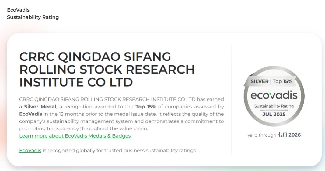 近日,中车四方所(中车制动)在EcoVadis企业社会责任评级中获得银牌,ESG实践成效获得国际认可。