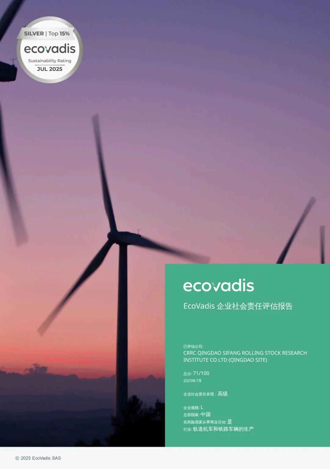 EcoVadis是全球公认的企业社会责任权威评级机构,通过环境保护、劳工与人权、商业道德、可持续采购四大核心维度,21项标准对企业社会责任进行分析和评估。目前,该评级已覆盖185个国家和地区,超过1500家大型跨国公司以EcoVadis评级结果作为遴选供应商的必备条件。此次通过银牌评级,是对中车四方所(中车制动)合规经营、绿色运营的高度认可,充分展示了企业可持续发展和社会责任方面的卓越表现。