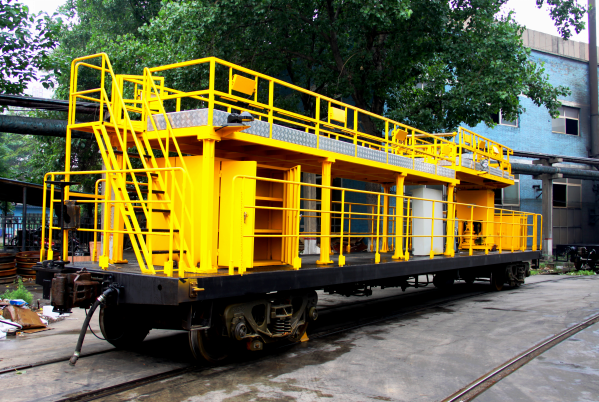 TY4DP型轨道平台车为非动力作业车,该车与接触网作业车可以组成车组,共同完成接触网的日常维护和调整工作。该车设有长达8000mm的固定平台和回转升降平台,为工作人员提供了较大的工作空间,利于多人同时作业,也利于穿梭作业,可大大提高工作效率,